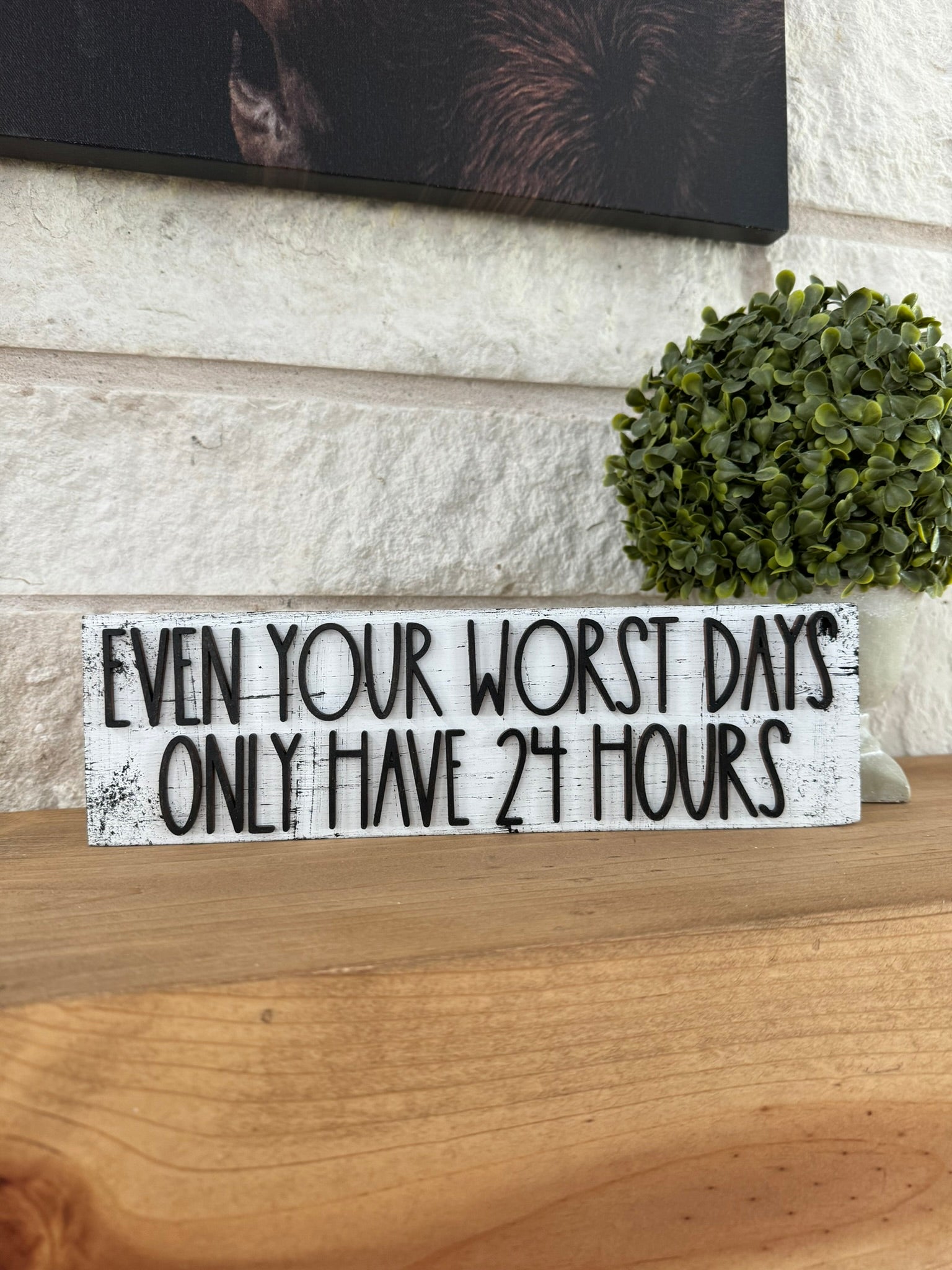 Introducing our uplifting and relatable sign that serves as a daily reminder that challenges are temporary and time is precious. The "Even Your Worst Days Only Have 24 Hours" sign is a simple yet powerful piece designed to inspire and motivate.