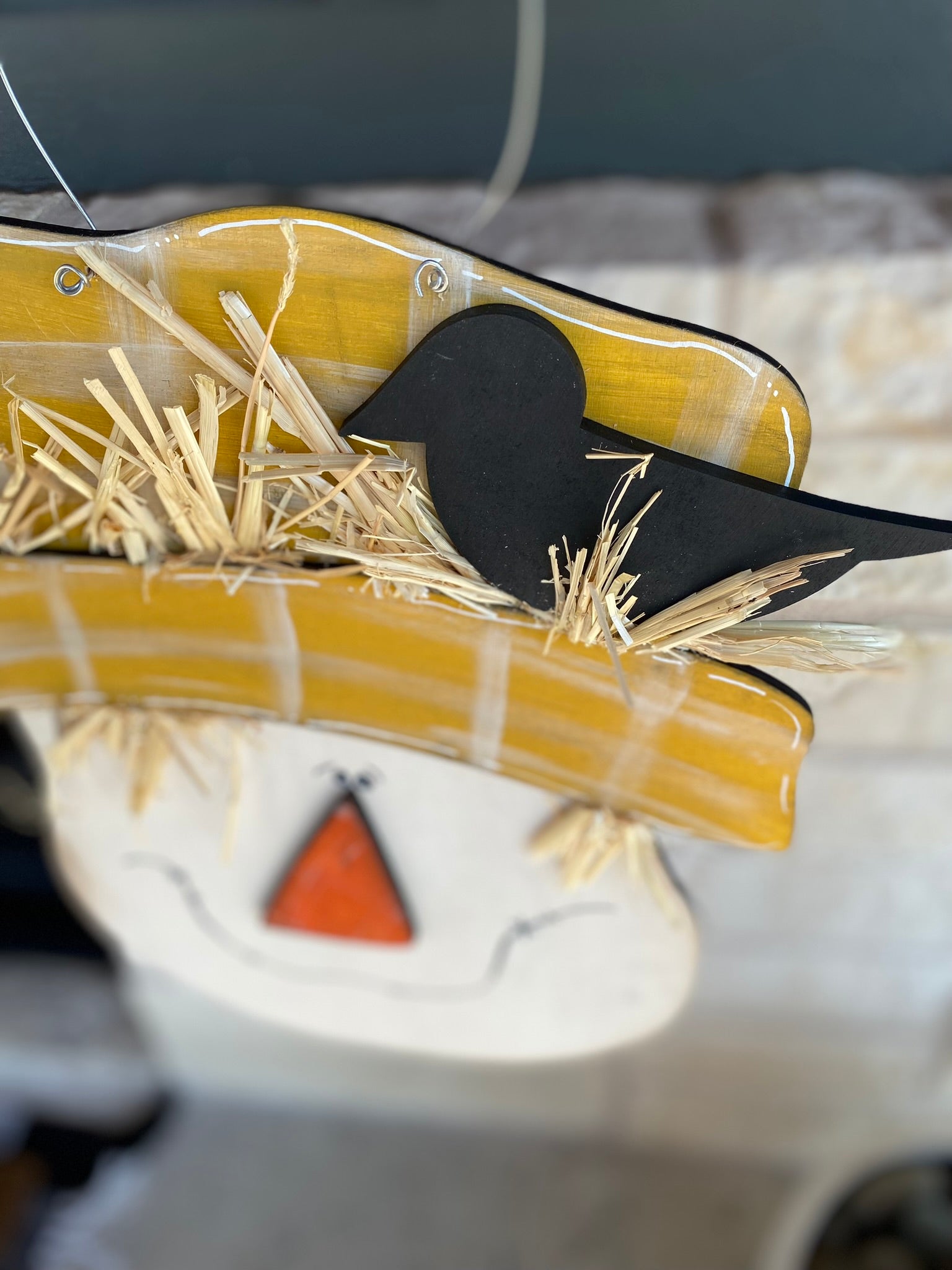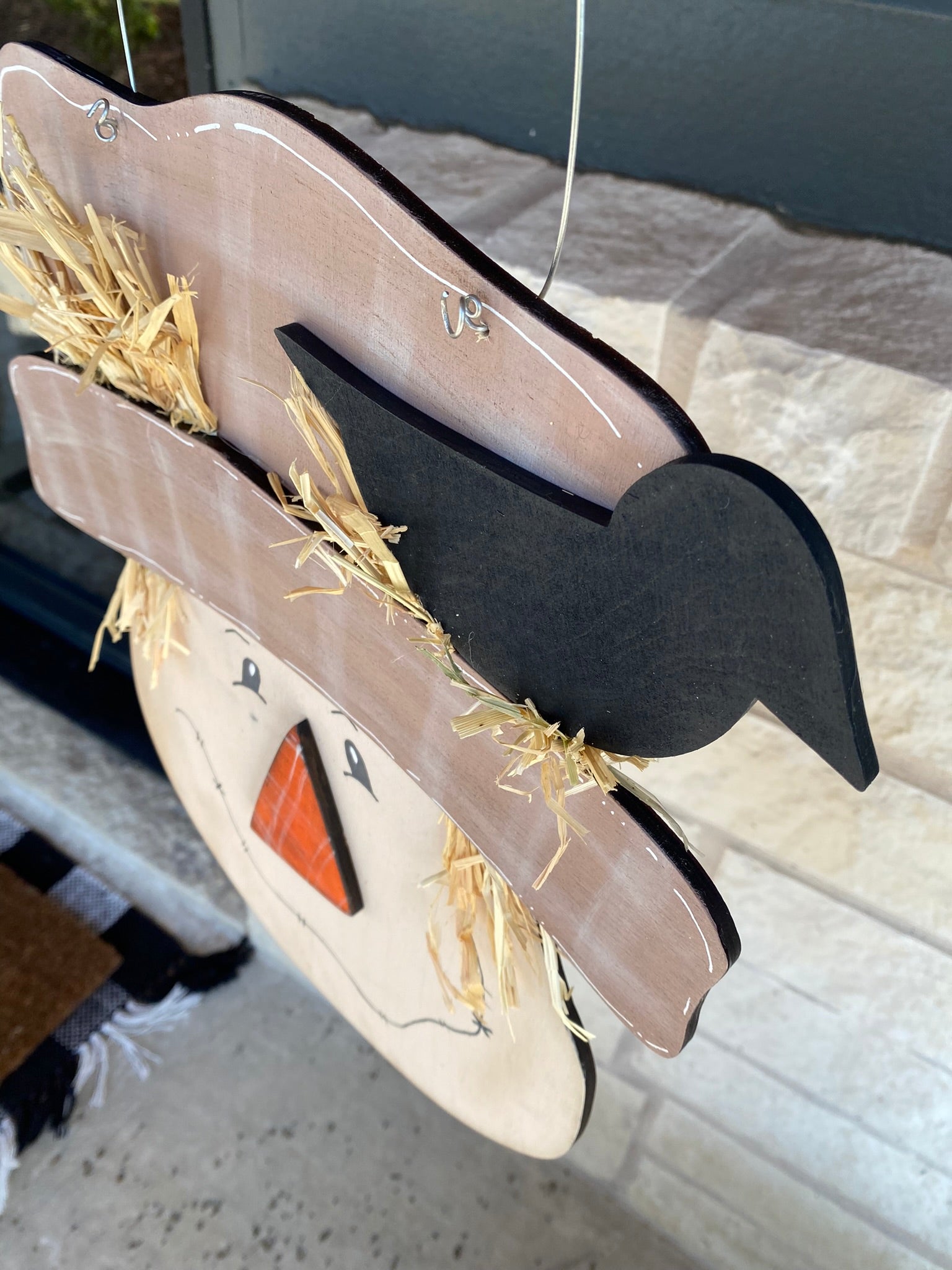 Add to your fall decorating with a hand painted scarecrow door hanger. This door hanger is made from 1/4" plywood which an measures approximately 14.5 x 12.5. Straw added for a stuffed scarecrow effect. A wire is used for hanging. Lots of curly raffia is attached under the hat band.
