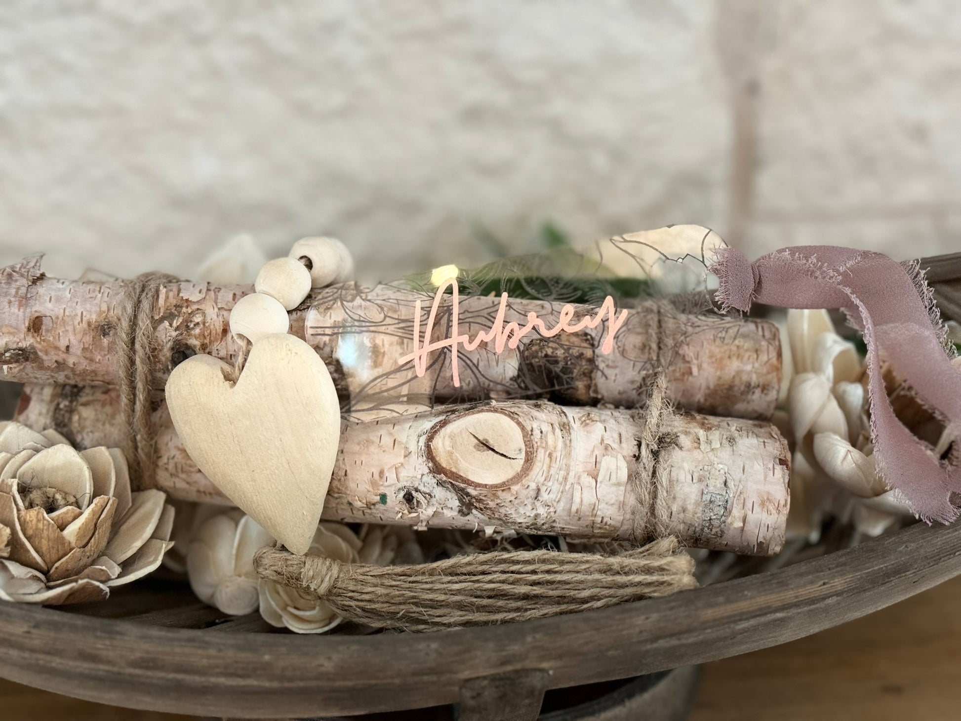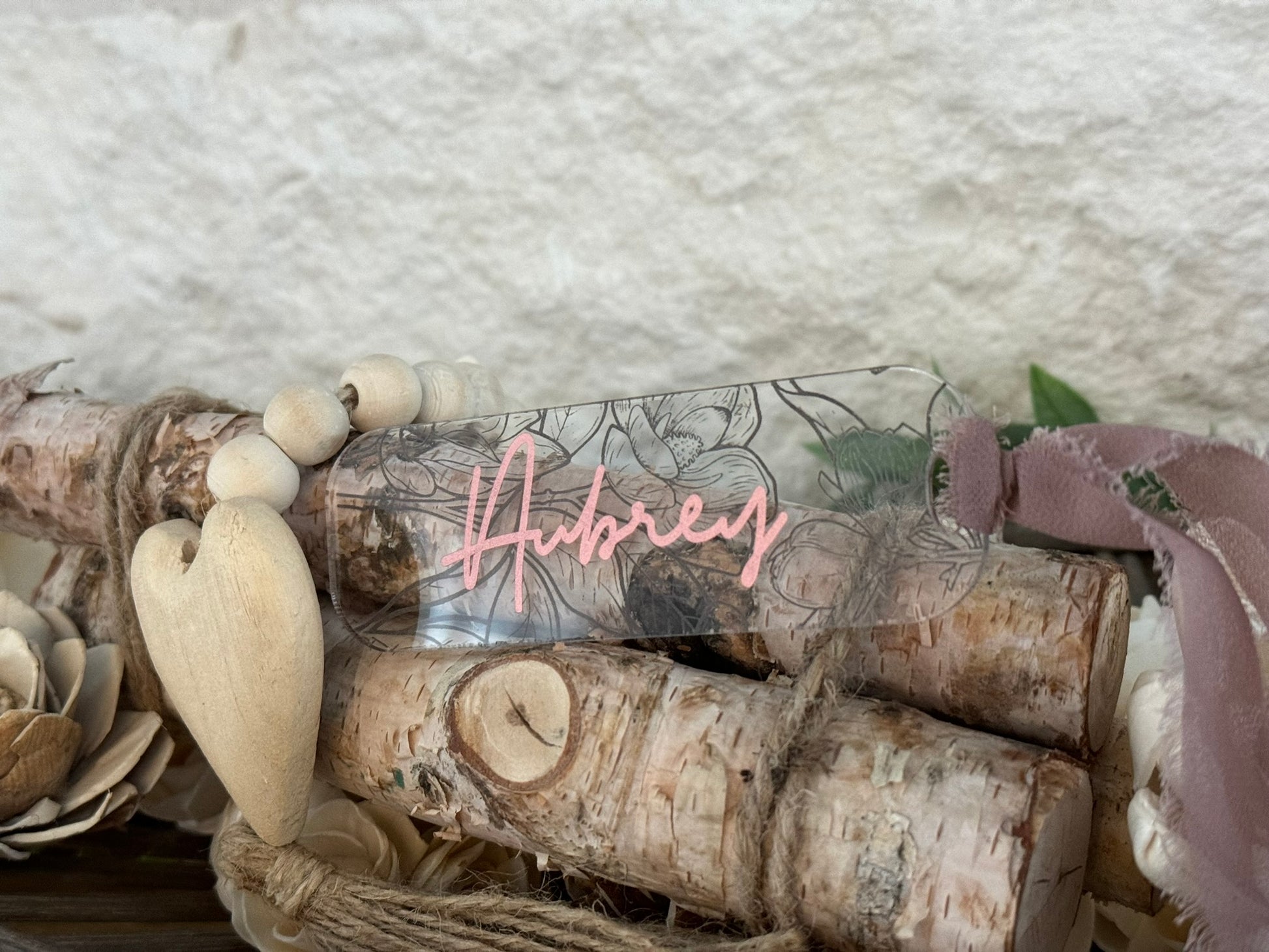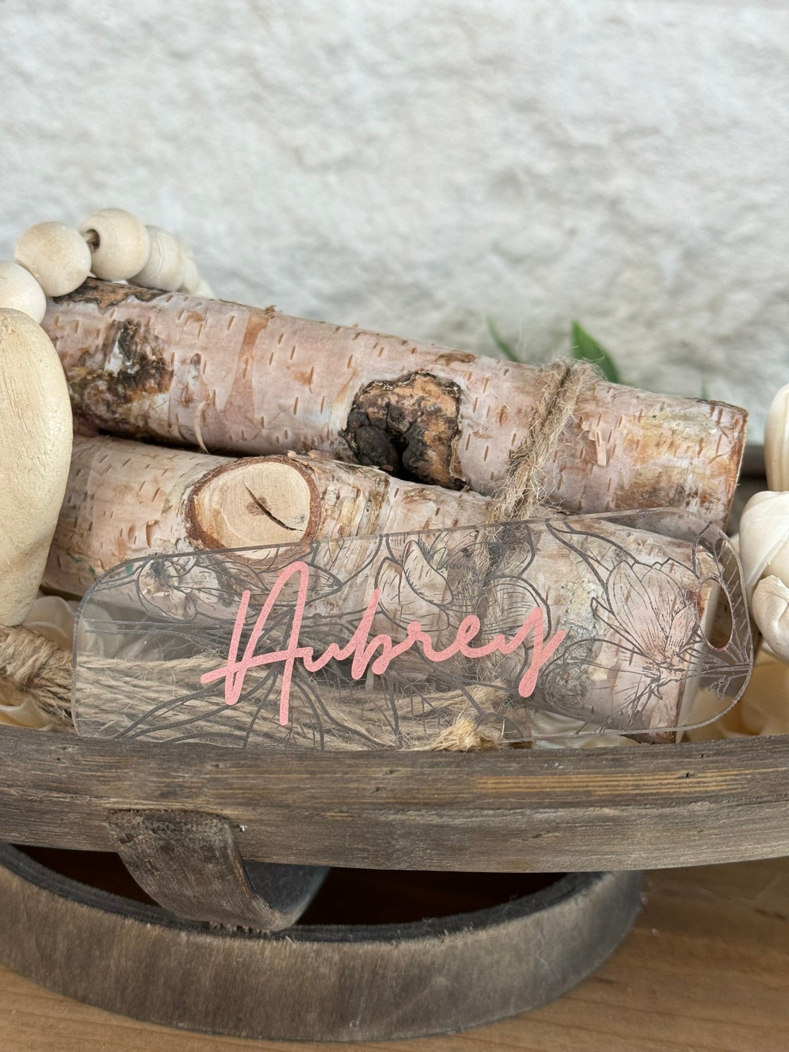 High-quality acrylic is cut and slightly engraved with a magnolia flower scene. The engrave is color filled, then a customized vinyl decal added on the reverse side. The finishing touch is a beautiful chiffon ribbon.